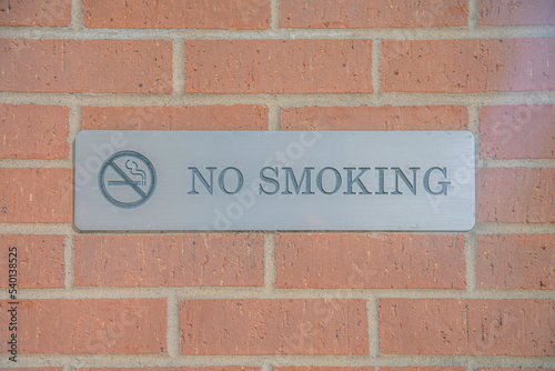 No Smoking sign debossed on a metal plate against brick wall of a building