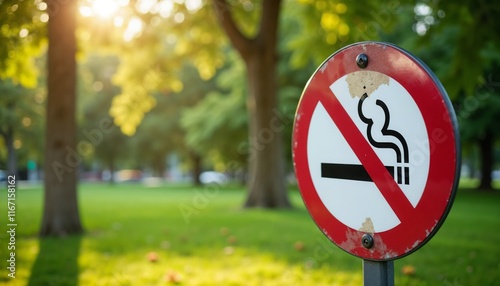 No Smoking Sign in Sunny Park Setting.Awareness. Responsibility. Healthy spaces.Public health poster, park safety campaign, awareness advertisement, outdoor policy visuals