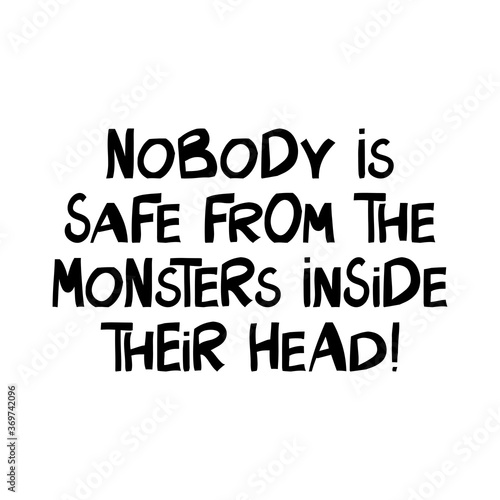 Nobody is safe from the monsters inside their head. Halloween quote. Cute hand drawn lettering in modern scandinavian style. Isolated on white background. Vector stock illustration.