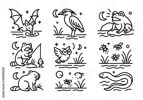 Nocturnal wildlife icons set – outline, linear, night animal silhouettes