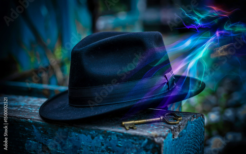 Noir Elegance A Moody Black Fedora Bathed in Ethereal Blue-Purple Light on Textured Surface, Cinematic Shadows & Starburst Glow