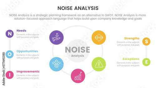 noise business strategic analysis improvement infographic with big cirlce shape combination on center information concept for slide presentation