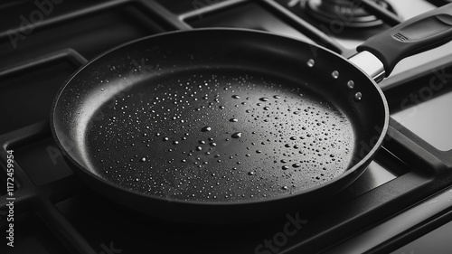 Non-stick Frying Pan Ready for Cooking: Close-up of a sleek black frying pan with water droplets, ready for cooking on a modern stovetop.