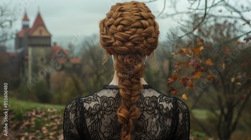 Nordic lady with an intricate braided hairstyle, set against a backdrop of a medieval castle, nordic beauty, historical elegance.