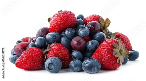 Normally arranged mix of strawberries and blueberries, other berries on white background, with photo-realistic details, professional color grading, soft shadows, low contrast, and clean sharp focus.