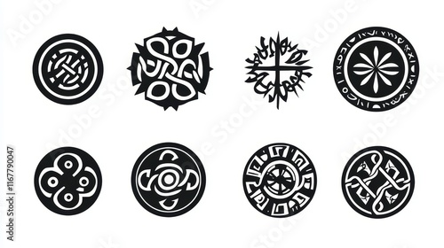 Norse runic graphic. Symbols of Scandinavian pagan esoteric beliefs, encompassing the Viking protection rune, triquetra, Yggdrasil, Vegvisir, Futhark, and Valknut icons. A modern Nordic compilation