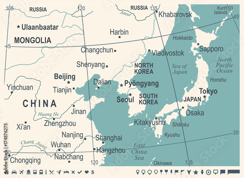 North Korea South Korea Japan China Russia Mongolia Map - Vintage Vector Illustration