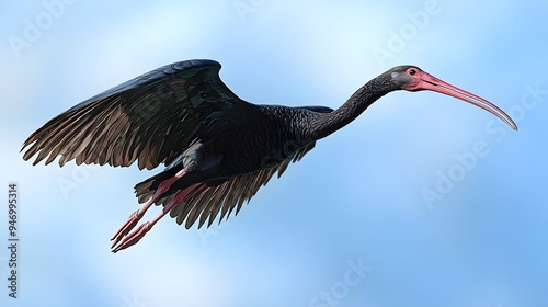 Northern Bald Ibis Hermit Bird Flying Under Blue Sky, Photo Realistic, Wallpaper, Cover and Screen for Smartphone, Cell Phone, Computer, Laptop, 9:16 and 16:9 Format