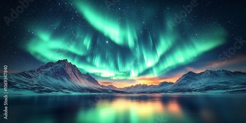 Northern Lights glowing above snow-covered mountains and beach landscape