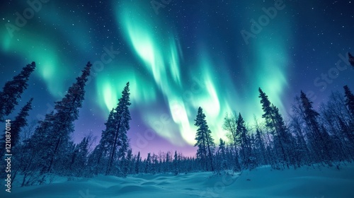 Northern lights illuminating a snow-covered forest under a clear starry sky.