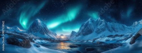 northern lights in snowy mountains. fabulously beautiful winter landscape.