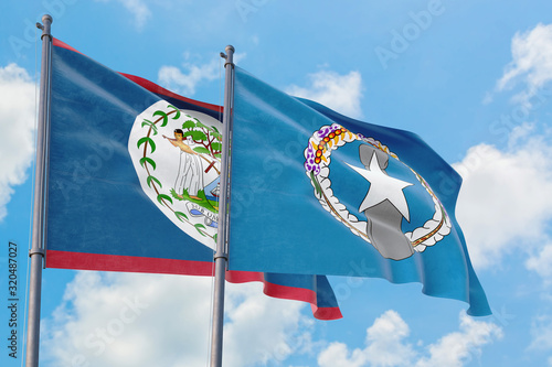 Northern Mariana Islands and Belize flags waving in the wind against white cloudy blue sky together. Diplomacy concept, international relations.