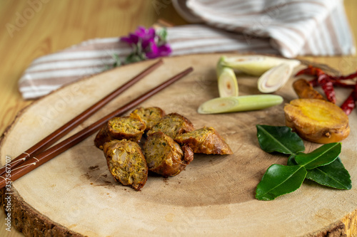 Northern Thai Spicy Sausage and spices on wooden cutting board.