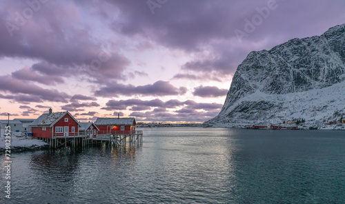 norway lofoten islands winter season snow covered landscapes beaches cloudy sky and colorful houses