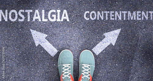Nostalgia and contentment as different choices in life - pictured as words Nostalgia, contentment on a road to symbolize making decision and picking either one as an option, 3d illustration