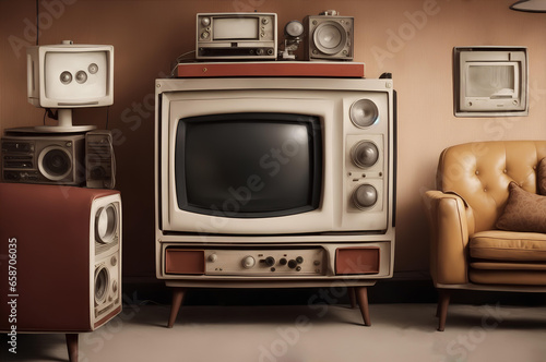 Nostalgia of old TV sets and broadcasting equipment for World Television Day (21st November) with retro couches to evoke the feeling of watching classic shows from the past