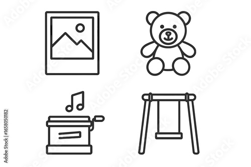 Nostalgic memories outline icon set. Childhood symbols: polaroid photo, teddy bear toy, wind-up music box, and playground swing. Simple retro vector graphic collection.