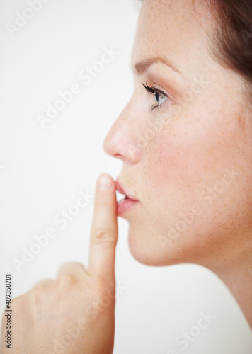 Not a word. Profile of a beautiful young woman with her finger on her lips.
