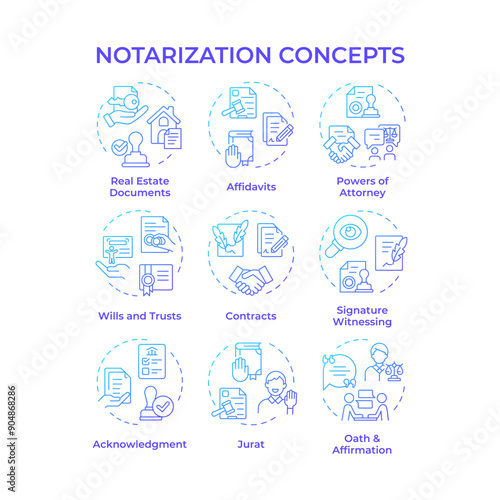 Notarization blue gradient concept icons. Contract business, notary services. Will and trust. Icon pack. Vector images. Round shape illustrations for infographic, presentation. Abstract idea