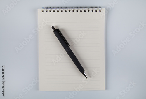 Notebook and black pen, white background.