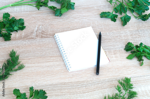 notebook and pencil on a wooden background and next to fresh greens. Diet concept