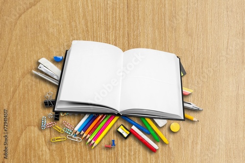 Notebook, pen, colored pencil on light background