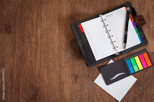 Notebook with Blank sheet of paper and Pen on wooden table background.