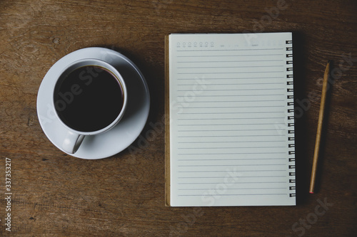 Notebook with coffee and pencil on wood table for writing at home. Work at home concept.