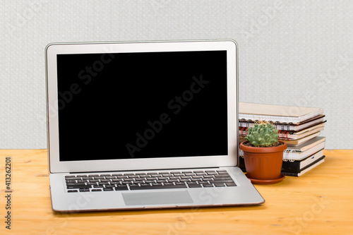 Notebook with notebooks and green succulent on a wooden table. mockup for text