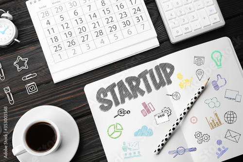 Notebook with text STARTUP, coffee and stationery on wooden table, flat lay