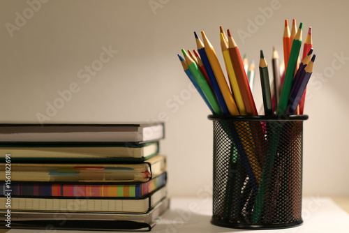 Notebooks stacked on the table, with a black metal pot holding colored pencils. Desk light for studying.