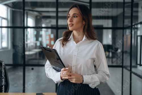 Notepad in hands. Beautiful woman is in the office