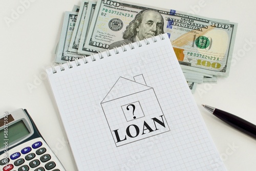 Notepad sheet with a drawn house and the word: Loan and a question mark on a table with a calculator, dollar bills and a pen. Real estate loan concept.