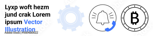 Notification bell, Bitcoin icon, gear symbol, call icon with blue detail, and placeholder text. Ideal for technology, finance, alerts, service, notifications, cryptocurrency and communication