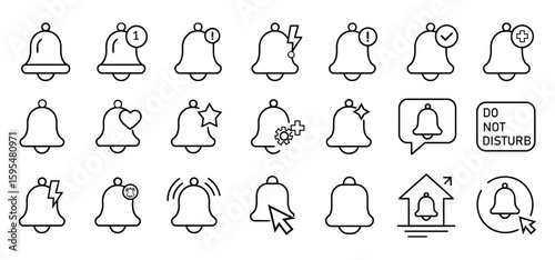 Notification bell icons set, Alert symbol line icons, reminder, message, alarm, do not disturb, settings, UI UX web app icons pack, Outline bell icons collection, Vector illustration