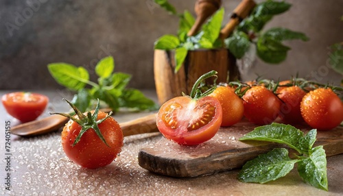 Nourishing Aesthetics: An Exquisite Culinary Symphony featuring an Array of Varied Spices, Fresh Vegetables, and Luscious Fruits, Presented Against a Rustic Backdrop. This Captivating Photo Setup Offe