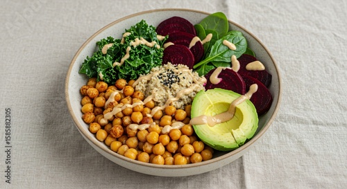 Nourishing Vegan Buddha Bowl Showcasing Roasted Chickpeas, Beets, Kale, Avocado and Creamy Dressing