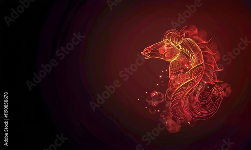 Nouvel An chinois, année du cheval, cheval doré sur fond rouge sombre et or, éléments décoratifs, ambiance festive et traditionnelle