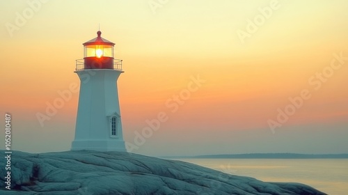 Nova Scotia Sunset: Peggy Cove Lighthouse on White Rock with Orange Light