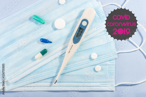 Novel coronavirus COVID-19 - protective medical masks and text Coronavirus COVID-19. Chinese coronavirus outbreak, Middle East respiratory syndrome coronavirus.