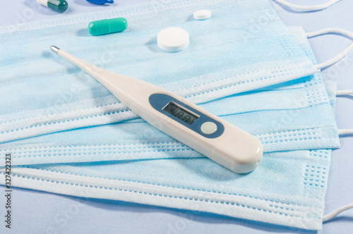Novel coronavirus COVID-19 - protective medical masks and thermometer. Chinese coronavirus outbreak, Middle East respiratory syndrome coronavirus.