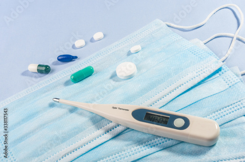 Novel coronavirus COVID-19 - protective medical masks and thermometer. Chinese coronavirus outbreak, Middle East respiratory syndrome coronavirus.