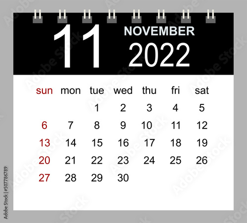 November 2022. Vector monthly calendar template 2022 year in simple style for template design. Week starts from Sunday.