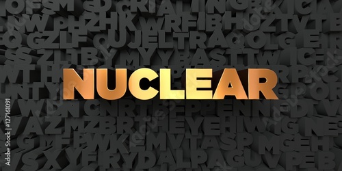 Nuclear - Gold text on black background - 3D rendered royalty free stock picture. This image can be used for an online website banner ad or a print postcard.