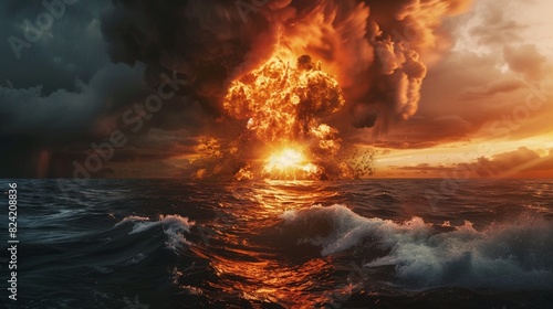 Nuclear blast in the sea, fiery aftermath, waves engulfed in flames, dramatic and destructive