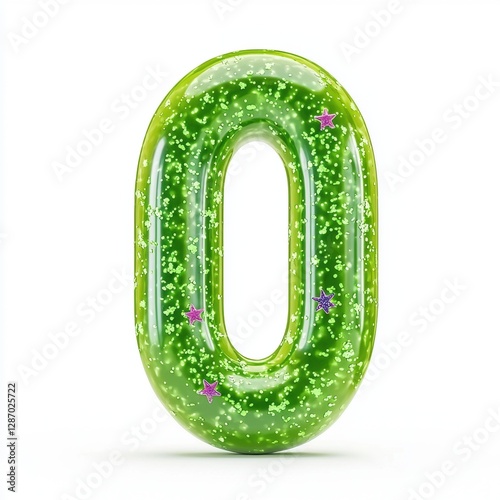 Number 0 made of neon green slime with iridescent star-shaped glitter floating inside isolated on a clean white background