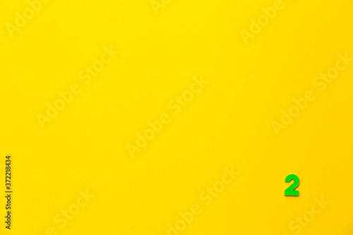 Number 2, two, the second of the plastic baby green toy number is located in the lower right corner on a yellow paper background. Banner on the topic of page numbering, timing or day in the calendar