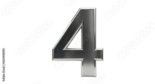 Number 4 made of shiny chrome metal with reflections and shadows on transparent background