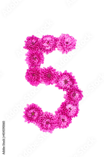 Number five of flowers, figures from pink Chrysanthemum, isolated on white background