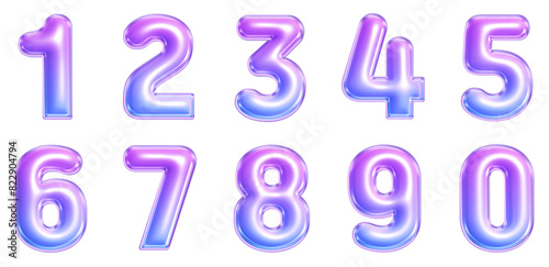 Number of voluminous balloon shapes from 0 to 9. 3d, Transparent background. Resources in png. (Blue and purple gradation)
